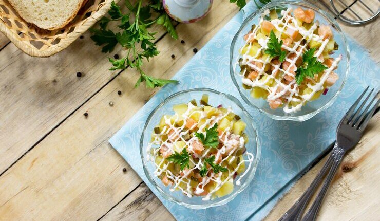 Для заправки салата можно использовать майонез, но если вы хотите добавить свежести, попробуйте смешать майонез с небольшим количеством лимонного сока и мелко нарезанной зеленью. Это придаст салату освежающий вкус.
