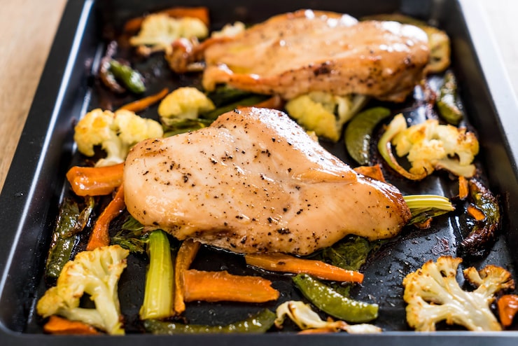 После маринования, выложите грудки на противень, застеленный пергаментной бумагой. Сверху положите несколько веточек розмарина и тимьяна, чтобы придать дополнительный аромат. Запекайте в предварительно разогретой духовке при температуре 180 градусов в течение 25-30 минут или до тех пор, пока мясо не станет белым и не перестанет быть розовым внутри.