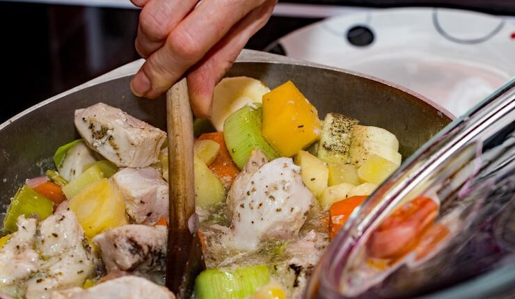 Теперь пришло время добавить овощи. Нарежьте лук и морковь и обжарьте их на той же сковороде, где жарилось мясо. Добавьте чеснок и перец и обжарьте еще минуту. Затем переложите овощи в кастрюлю к мясу.
