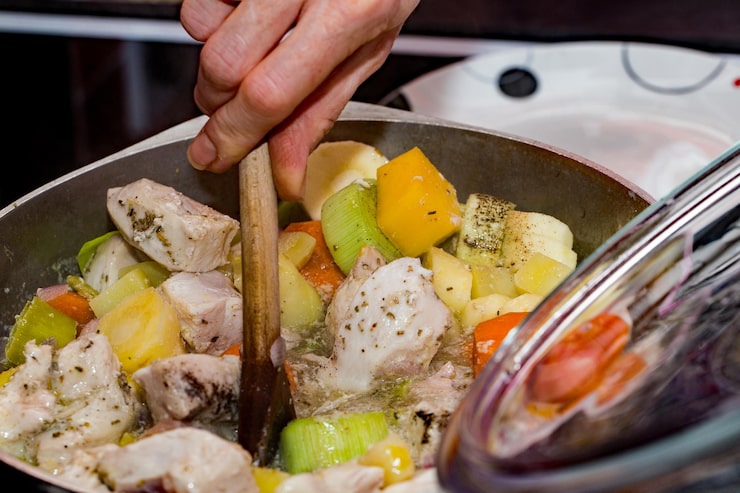 После этого добавьте картофель и достаточно воды, чтобы покрыть все ингредиенты. Доведите суп до кипения, затем убавьте огонь и дайте ему томиться в течение 30-40 минут, пока картофель не станет мягким.
