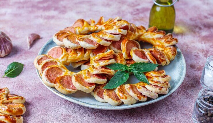Начните с размораживания слоеного теста, если вы используете замороженное. Затем раскатайте тесто на ровной поверхности до толщины примерно 3-4 мм. Нарежьте тесто на полоски шириной около 5 см. Оберните каждую колбаску тестом, плотно прижимая края. Уложите колбаски на противень, застеленный пергаментной бумагой, и отправьте в разогретую до 200 градусов духовку на 20-25 минут.