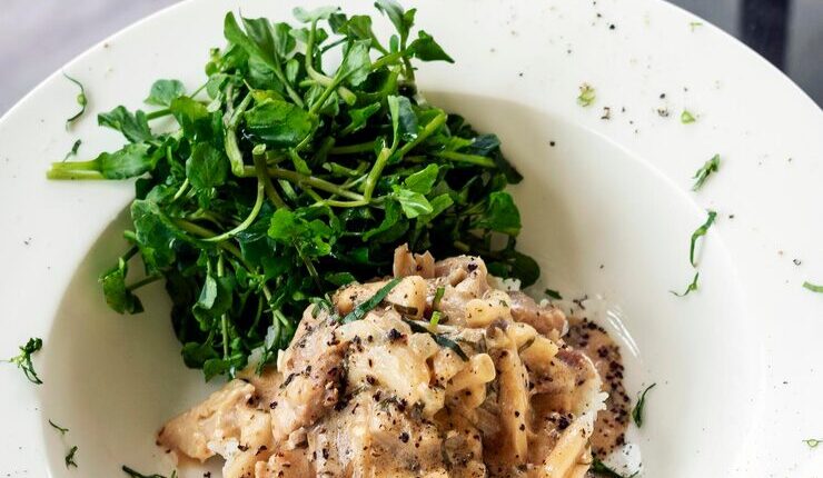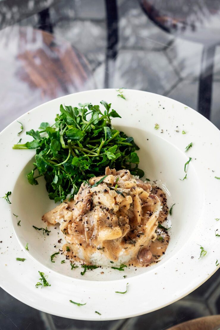 Возвращаем мясо в сковороду, добавляем сливки и тушим все вместе в течение 10-15 минут, пока соус не загустеет. При желании можно добавить немного муки, чтобы соус стал более густым.
