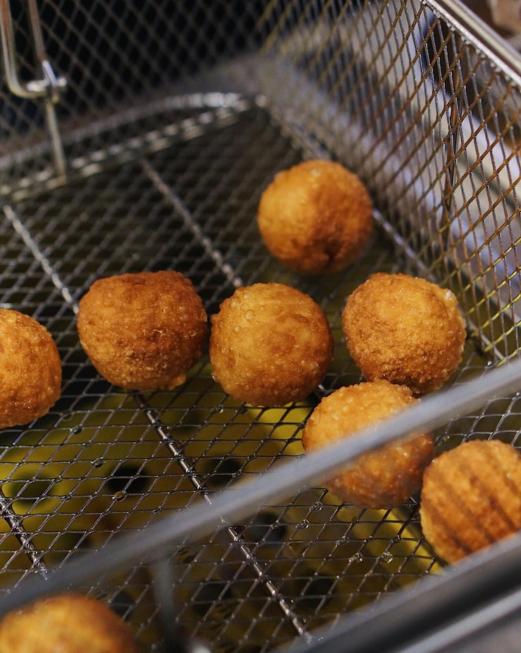 Теперь пришло время приготовить фритюр. Нагрейте масло во фритюре до температуры 350°F (175°C). Осторожно опустите сырные шарики в масло и жарьте их до золотистого цвета. Это займет примерно 2-3 минуты. Убедитесь, что вы не переполняете фритюр, чтобы шарики не прилипали друг к другу.