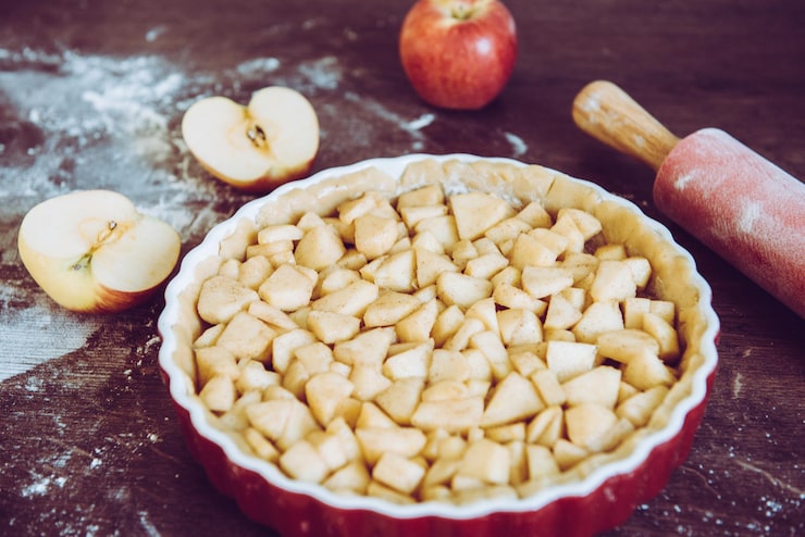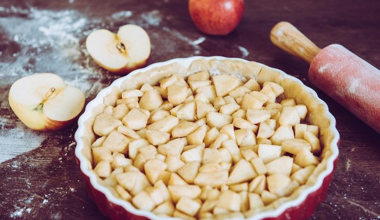 Теперь вы можете наполнить основу для яблочного пирога начинкой из яблок и приступить к выпечке.