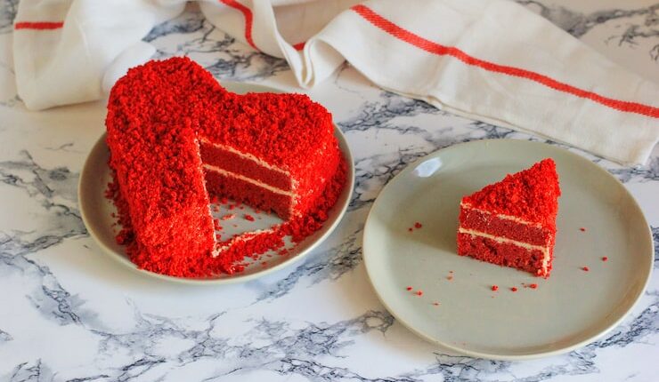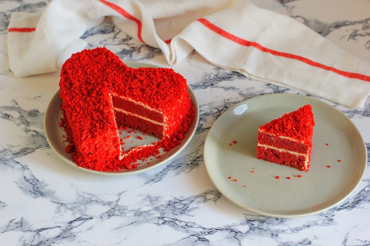 250 грамм муки, 200 грамм сахара, 100 грамм масла, 2 яйца, 100 миллилитров молока, 1 чайная ложка разрыхлителя, 1/4 чайной ложки соли, 1 столовая ложка какао-порошка, красный пищевой краситель (по желанию).