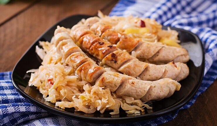 Начните с подготовки ингредиентов. Тщательно вымойте и нарежьте капусту на небольшие кусочки. Сосиски можно нарезать кружочками или разрезать пополам в зависимости от ваших предпочтений.