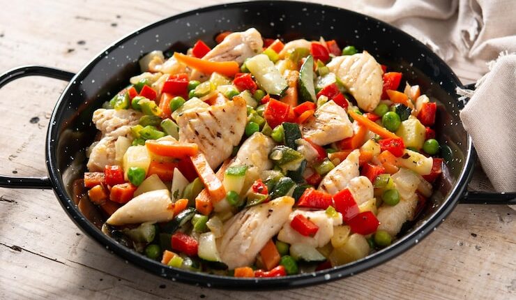 Для приготовления возьмите филе минтая, нарежьте его на кусочки и обжарьте на сковороде до золотистой корочки. Затем добавьте нарезанные овощи — например, морковь, лук и болгарский перец. Тушите все вместе на медленном огне, пока овощи не станут мягкими, а рыба не будет готова.