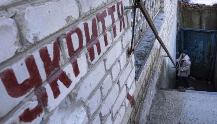 Женщина спускается в бомбоубежище во время воздушной тревоги на Украине . Архивное фото