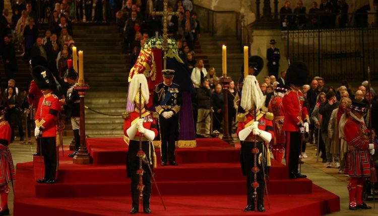 Вестминстерский дворец круглосуточно открыт для желающих проститься с королевой. Закрытый гроб, покрытый королевским штандартом, располагается на специальном возвышении в Вестминстер-холле, старейшей из сохранившихся частей дворца.