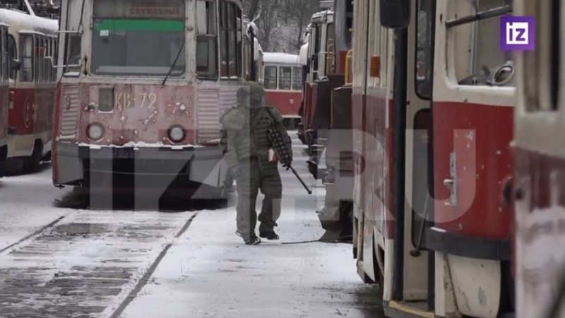 На месте разрушенного депо работают саперы инженерных войск, которые идут строго вдоль трамвайных путей, так как на разбитых рельсах всё еще могут быть мины.