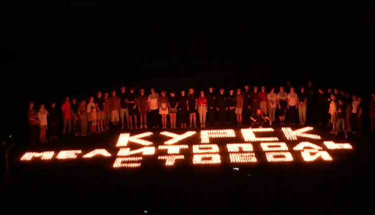 В центре города волонтеры выложили из зажженных свечей надпись «Курск, Мелитополь с тобой!».