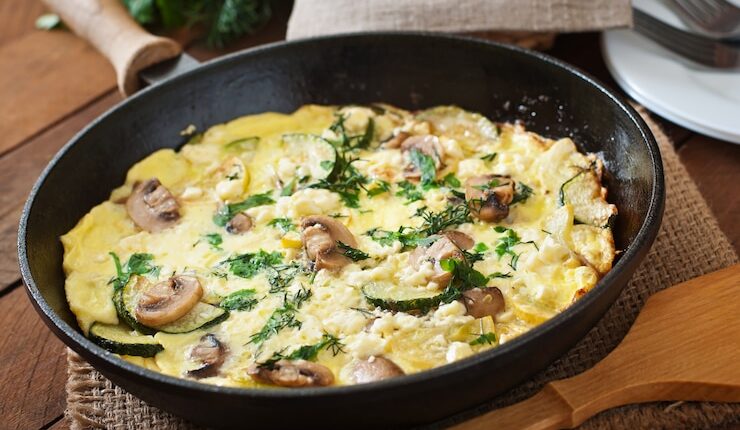 Когда яйца почти готовы, но еще слегка жидкие в середине, добавьте наполнители, если используете. Затем сложите края яиц внутрь, чтобы сформировать треугольник или прямоугольник.