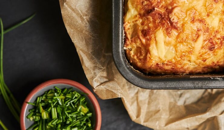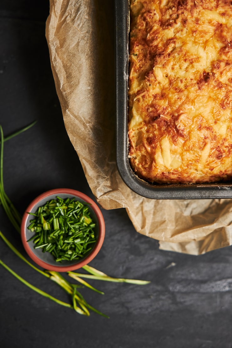 Теперь переложите смесь в форму для выпечки. Убедитесь, что она равномерно распределена по всей поверхности. Если вы хотите, можете посыпать верх запеканки тертым сыром для хрустящей корочки.